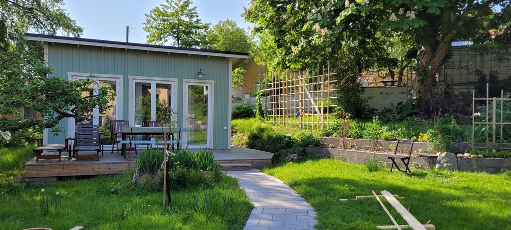 The garden is 1500 squaremeter with kitchengarden, fruit trees and plenty of space to play and have outdoor meals.