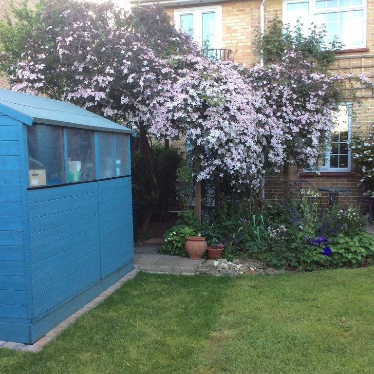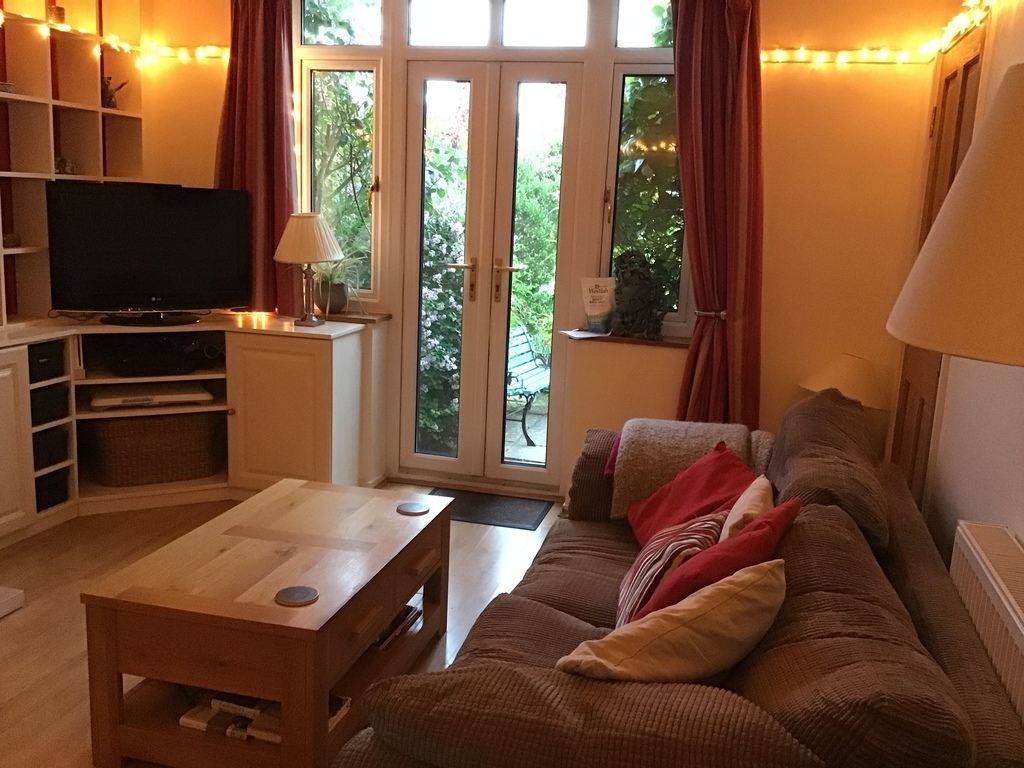 We have a lovely sunny garden with pond which backs on to fields and two patio areas for sitting and eating outside together with a summerhouse with electricity, heating and lighting.