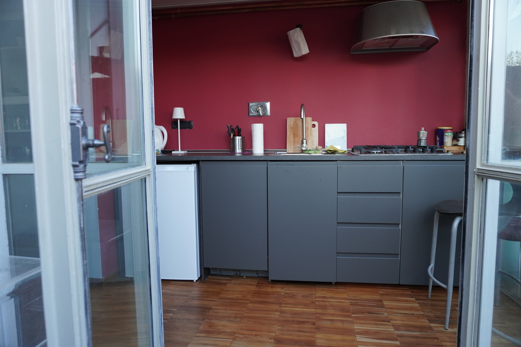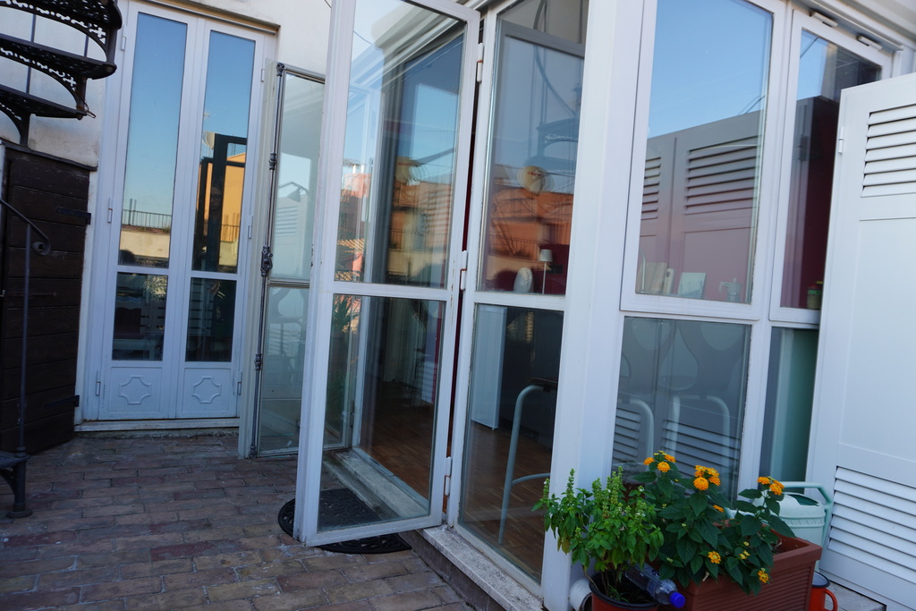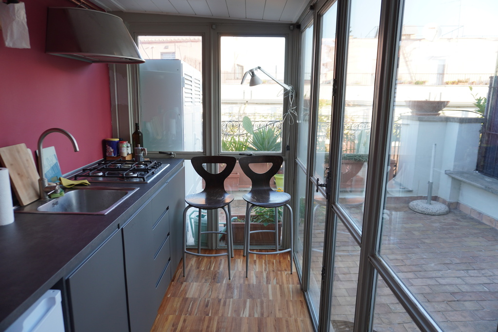 L'attico si trova al 6° piano di una palazzina storica, senza ascensore, con vista mozzafiato sui tetti e le cupole della Città Eterna. E' composta da: camera da letto, ampio salone con divano-letto a 2 piazze, piccolo bagno con doccia, cucina con terrazzo più terrazzo attico. Sia la camera da letto che la cucina hanno tetto e muri parzialmente in vetro. L'appartamento è munito di aria condizionata.