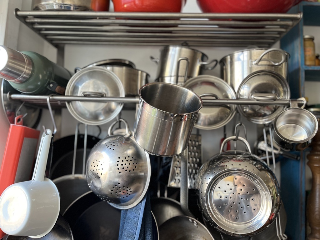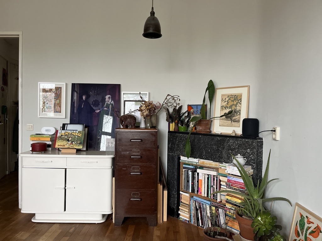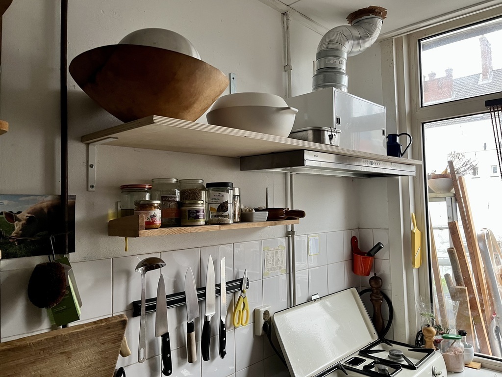 The kitchen is made of reclaimed furniture with open shelves and has a big fridge, dishwasher, electrical (steam) oven and a retro gas stove. Our quirky home is also pretty full, it reflects our personal passions like comics and love for vintage.