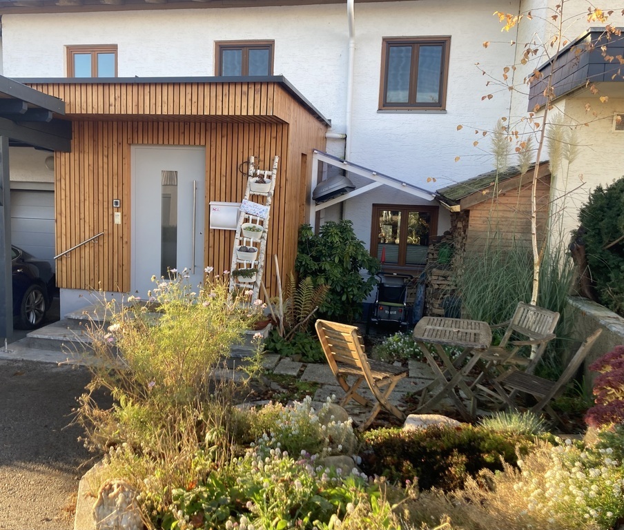 Our terraced house is situated on a hill in a quiet neighbourhood. From the terrace you can even see the mountains, and the garden is terraced, with a small meadow with a slide, swing and sandpit, as well as a pond. A large walnut tree provides lovely shade in summer. Our terraced house has a cellar with sauna, a nice living-dining area and the bedrooms and bathroom on the upper floor.