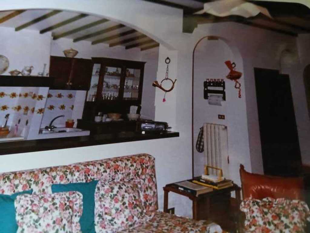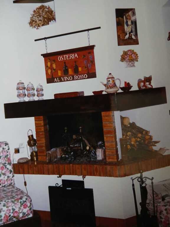 Ampio soggiorno, con camino e cucina a vista .